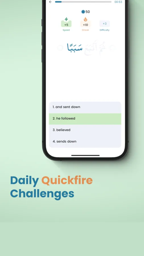 Once you get to about 65% understanding, unlock a daily Quran translation challenge tailed to your vocabulary.