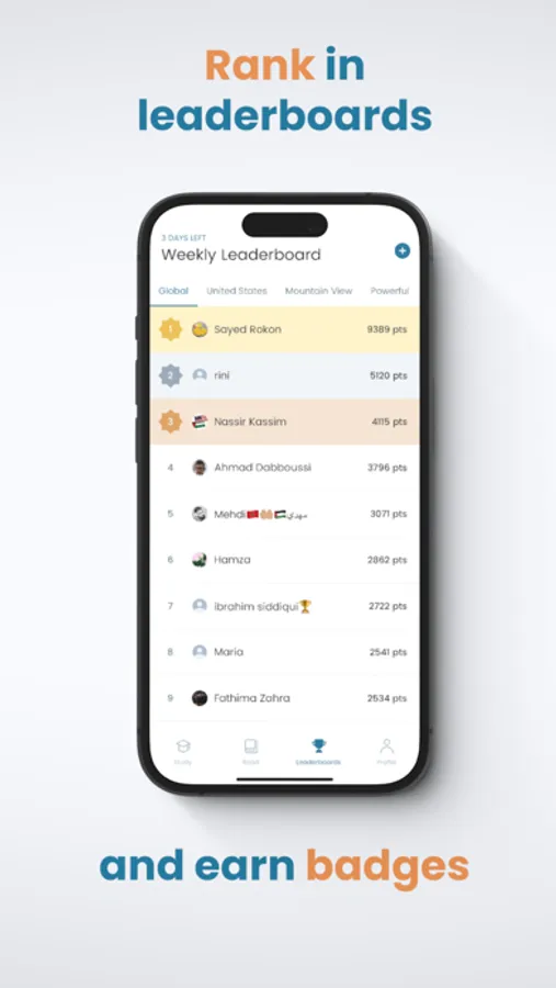Earn points with each activity and win badges by competing with Kalaam users world-wide, or just those in your country or city.
