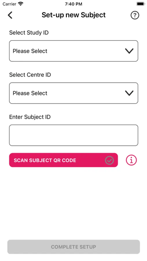 Set-up subject: The aim of this process is to uniquely link a study participant (subject) to a QR code.