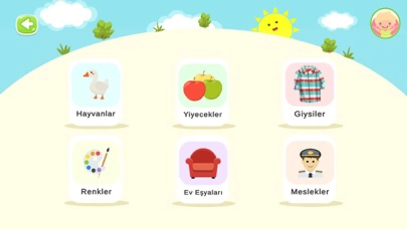 - Bu kavramlar: Hayvanlar, Yicecekler, Giysiler, Renkler, Ev Eşyaları ve Meslekler’dir.