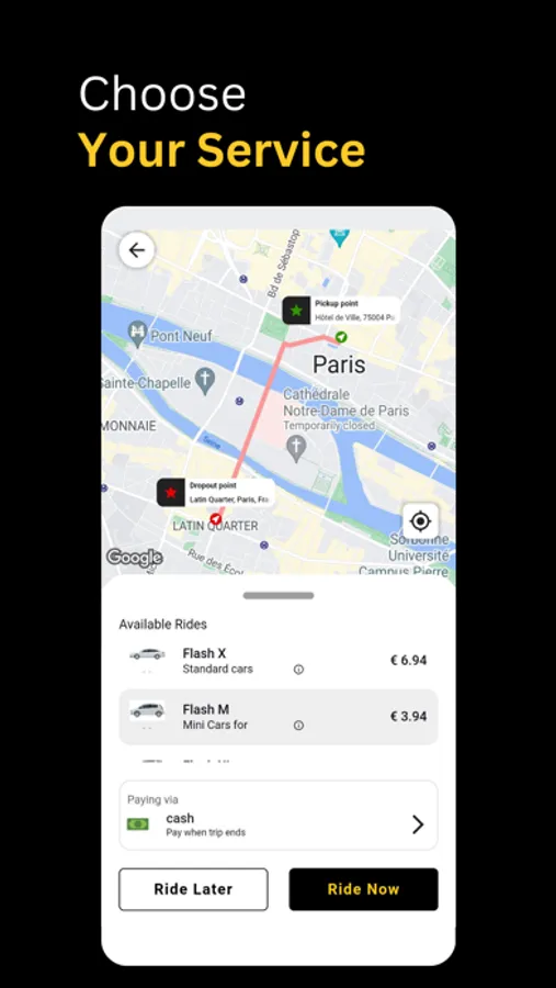 Flash also offer additional features, such as the ability to choose a specific type of vehicle, schedule a ride in advance, or book a ride for someone else.