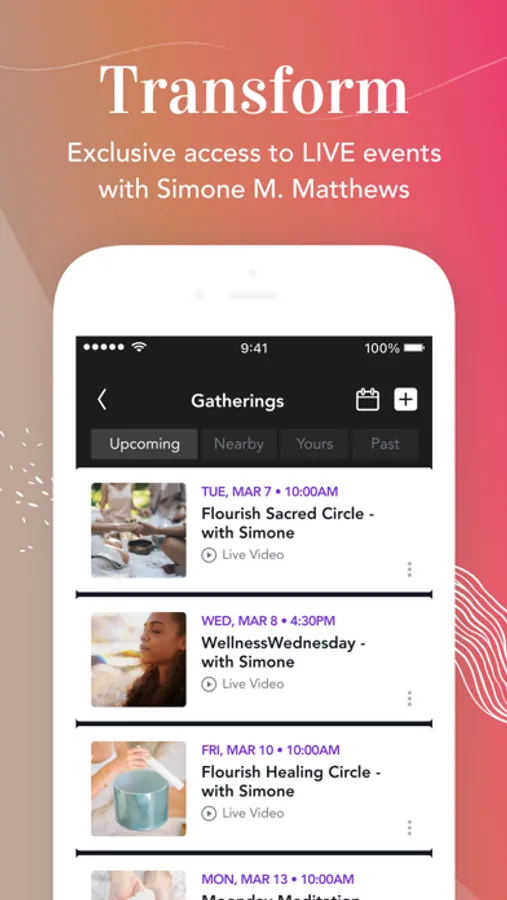 Flourish Flow guides your Flourish experience— where Community Members narrate & personalise their own personal daily, weekly & monthly flow through Meditation, Wellness Practices, LIVE Streams with Simone, and Intuitive Astrology guidance. You can even up-level your experience through Courses & SoulBook immersions.