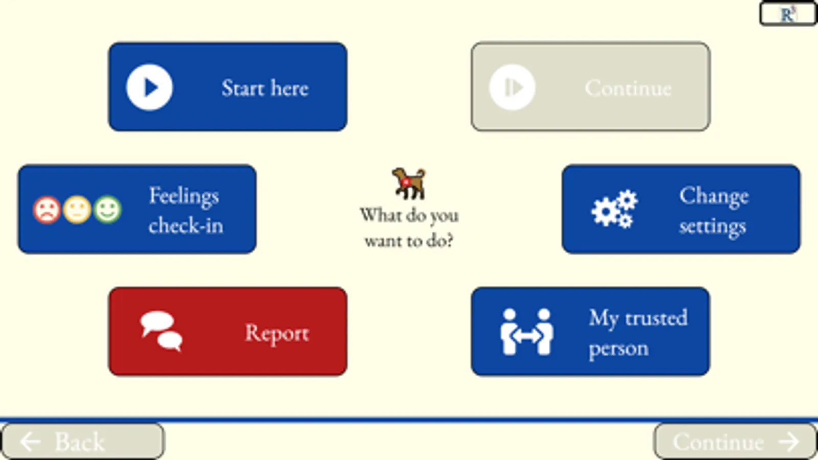 Learning about abuse can be upsetting, so the R3 app allows you to take a break at any time. You can stop a topic whenever you want by tapping the Home button in the app. You can also go to the Feelings check-in on the main screen of the app for calming activities.