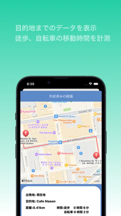「Yotteko」は、出発地点と目的地点を選択するだけで、徒歩や自転車での移動距離や時間を表示するアプリです。目的地までの最短ルートを見つけることができます。