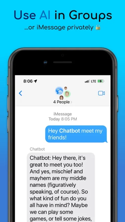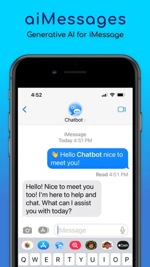 aiMessages is an AI integration for the Messages app. aiMessages fully supports Messages' best features such as iMessage, iMessage Stickers, interactive iMessages, and more. Bring your iMessage conversations to life with text, images, & stickers created by state-of-the-art generative AI!