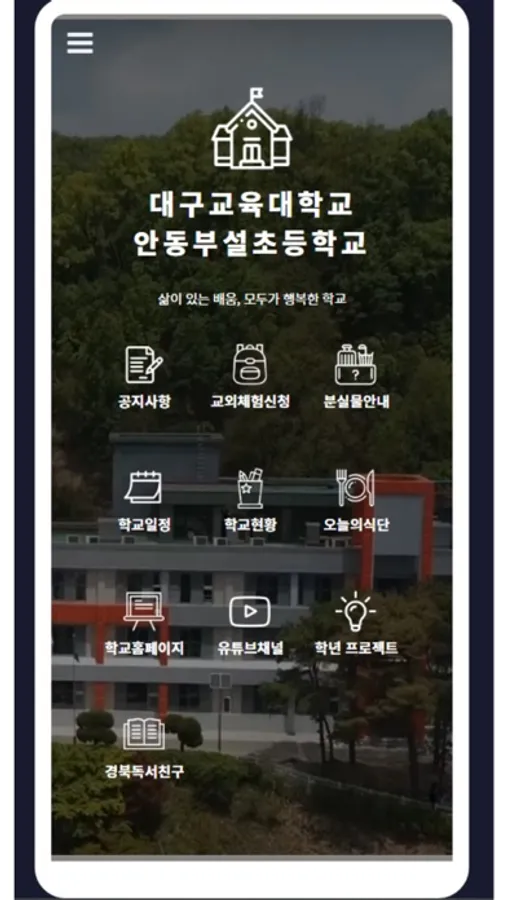 대구교육대학교 안동부설초등학교 앱입니다. 학교 일정, 학교 소식 및 교육활동 모습, 분실물 안내 등을 살펴볼 수 있으며, 교외체험신청과 경북도서친구 등에 쉽게 접속할 수 있습니다.
