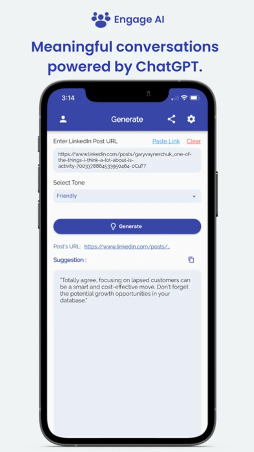 Engage AI use AI to write insightful and relevant comments on LinkedIn™ so you can break the ice and build relationships.