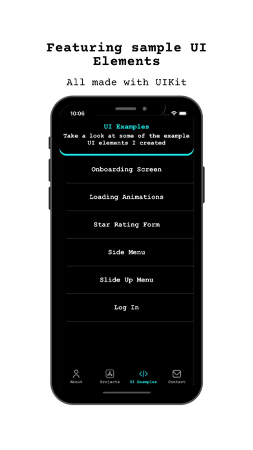 -A tableView showcasing all my UI sample elements, like a working review form, a side menu, and more.