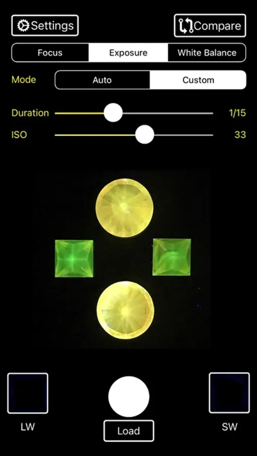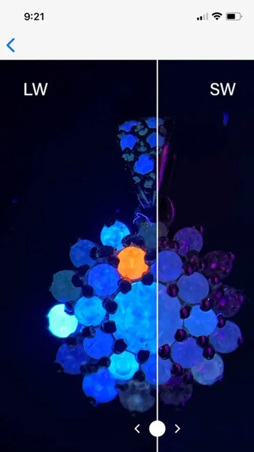 The app allows you to use your camera to take images of jewelery or gemstones , using the same settings for both short-wave ultra-violet (SWUV) and long-wave ultra-violet (LWUV) illuminations. The controlled settings are for exposure, ISO, colour temperature and focus. The two images can then be compared either through alternating views or using a slider. Images with SW and LW labelling can be saved to your image gallery. These observations can help a gemmologist determine whether a diamond or gem is synthetic or treated.