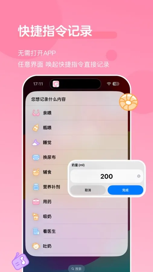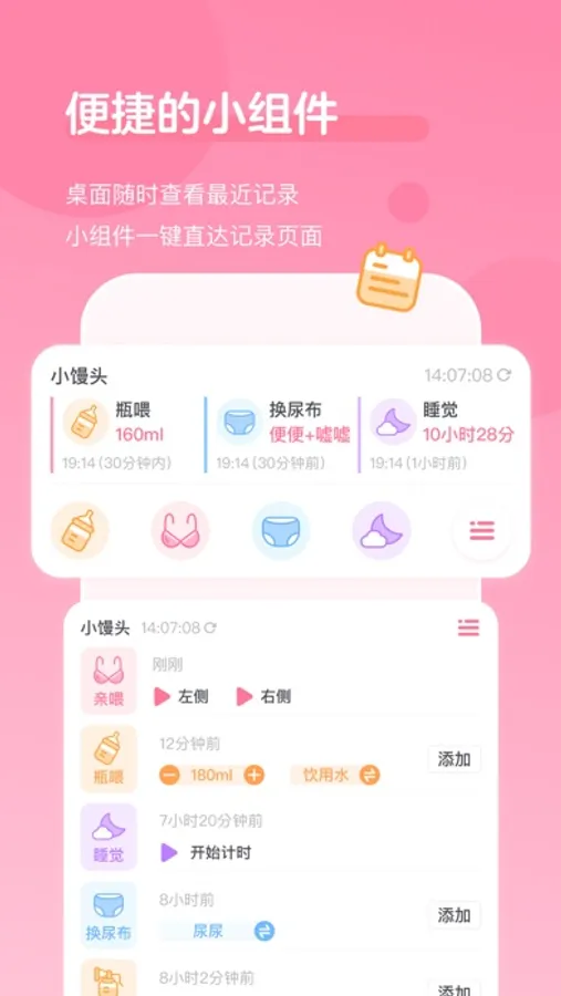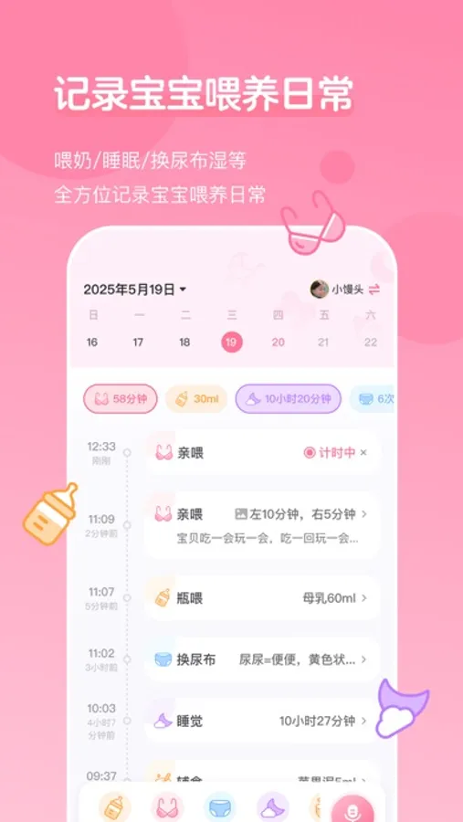 +哺乳喂食记录:可记录母乳亲喂、母乳瓶喂、配方奶等多种喂养数据;完全覆盖哺乳期间所有喂养方式,记录更全更便捷。