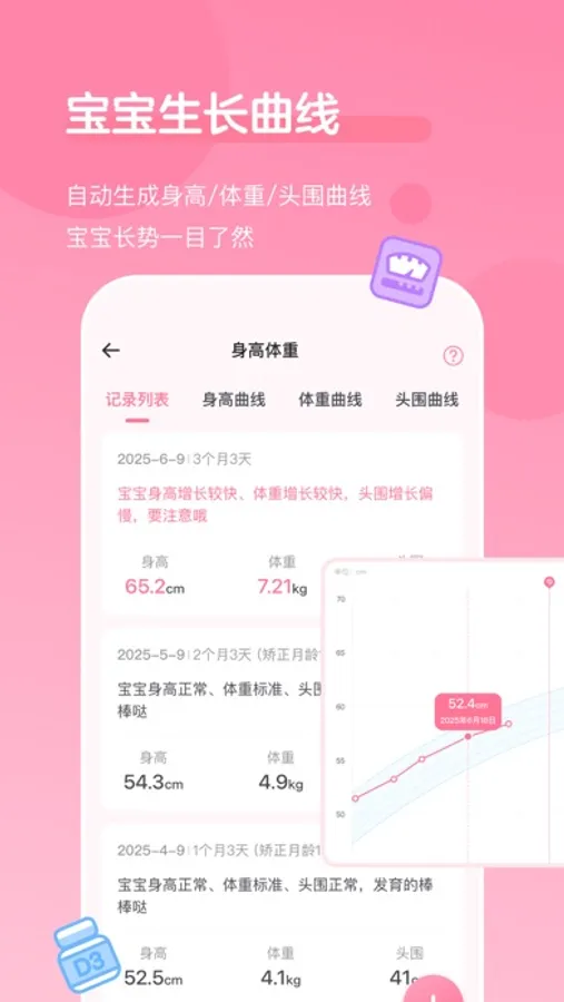 +成长数据:记录宝宝身高、体重、头围数据,并能生成宝宝成长曲线图,还可与世卫组织百分位曲线图对应比较哦。