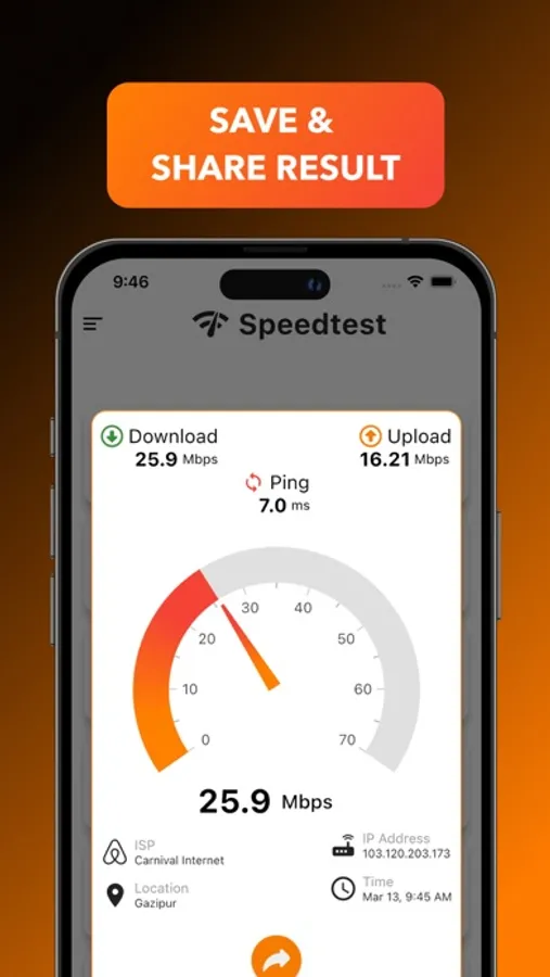 With just one tap, it will test your internet connection through thousands of servers worldwide and show accurate results within a few seconds.