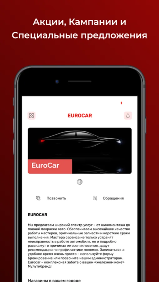 Eurocar – это мобильное приложение автосервиса, который предлагает широкий спектр услуг для вашего автомобиля. Наша команда мастеров обеспечивает высочайшее качество работы, используя только оригинальные запчасти и короткие сроки выполнения. Мы не только устраняем неисправности, но и даем рекомендации по профилактике поломок. Бронирование нашего сервиса очень просто с использованием формы в приложении или звонком нашим администраторам. В нашем приложении вы найдете программу лояльности, каталог услуг, акции и возможность онлайн записи на удобное для вас время. Eurocar - комплексная забота о вашем "железном коне". Один из основных преимуществ нашего сервиса - мультибрендовость, мы готовы обслуживать автомобили любых марок.