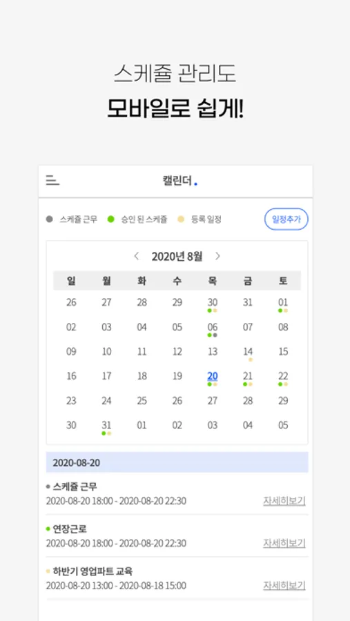 언제 어디서나 모바일로 간편하게 근무관련 사항(연장근로, 휴가, 출장, 외근)을 신청하고 근로 내역을 조회할수 있습니다.