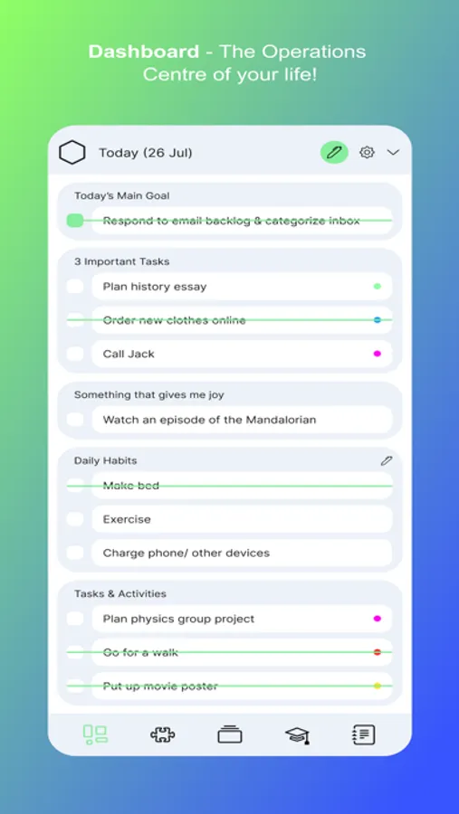 Your go-to operations center for managing each day. Instead of a looming and overwhelming list of tasks, this page is split into the following sections to maximize productivity: