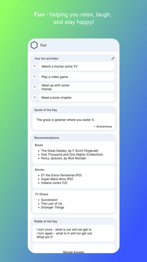 This page is purpose-built to help you relax and have fun. You can add your favorite fun activities from a pre-built list, or create your own, and then add these to your daily activities section with ease.