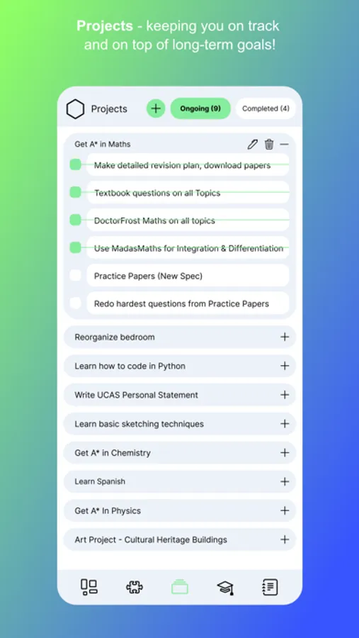 Here, you’ll be able to manage all the long-term projects you want to get done – from reorganizing your room, to learning to code, to getting great exam grades!