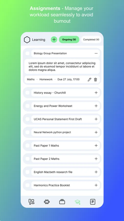 Whether for work or school, stay on top of your assignments with this page. Give each assignment a description, a due date, and a category, and see it through to completion.