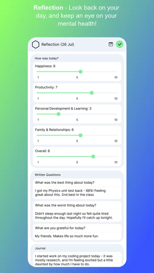 At the end of each day, it’s vital to take a moment to reflect. With Lifemaster, you can rate each day from 1-10 in terms of Happiness, Productivity, Personal Development & Learning, Family & Relationships, and Overall.