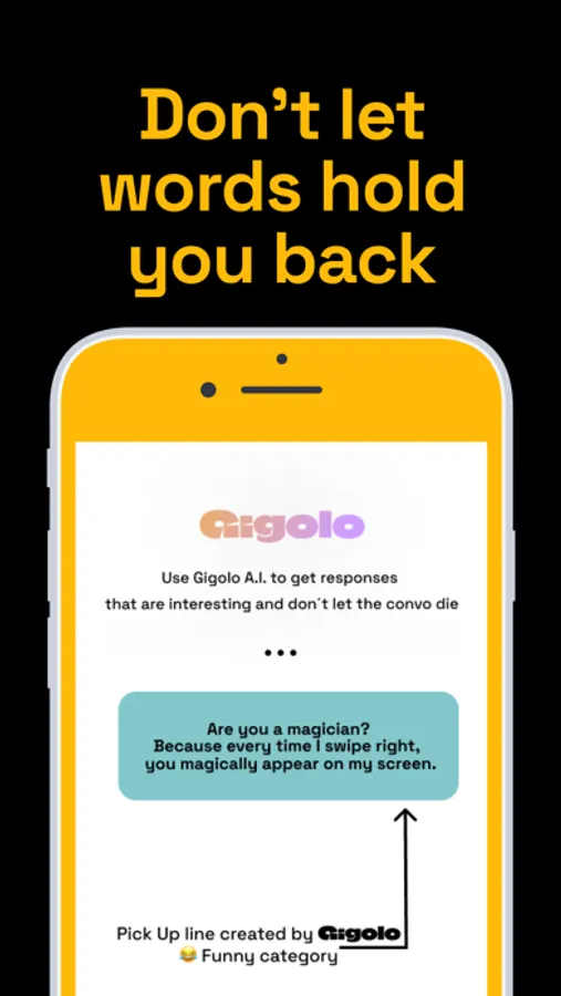 Are you tired of struggling to come up with clever responses to keep your conversations going? Say goodbye to those awkward silences and hello to gigolo, the app that gives you instant access to a range of smart, flirty answers. Whether you’re using dating apps or flirting with someone through messages or social media, gigolo can help you keep the conversation flowing with ease. With a variety of categories to choose from, you can find the perfect response for any situation - from witty comebacks to playful banter. Impress your crush or show off your personality with gigolo - never be at a loss for words again& start flirting like a pro!