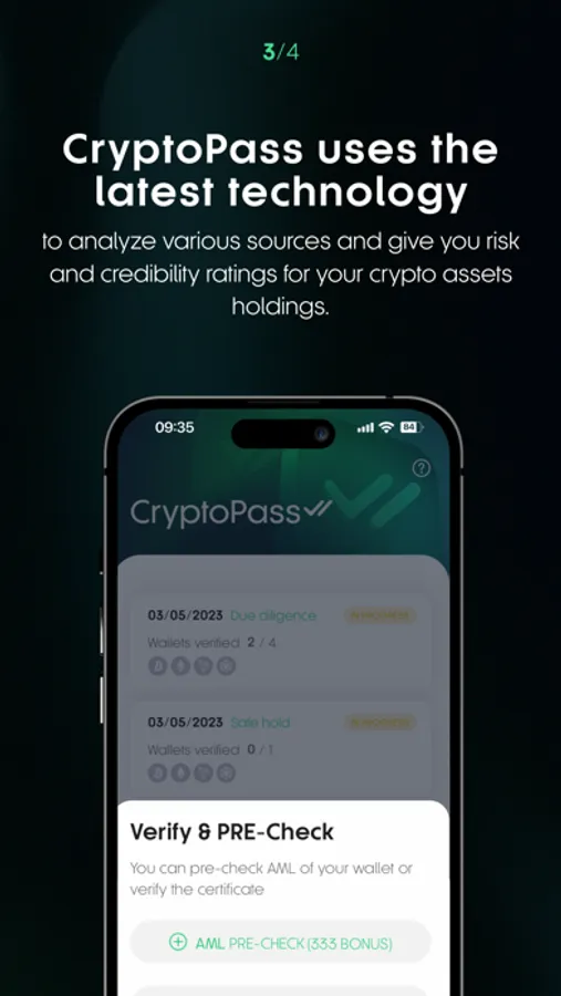 CryptoPass is the ultimate app for anyone who wants to stay on top of their crypto investments and ensure compliance with all necessary regulations. This powerful tool uses patented Know Your Wallet (KYW) technology to provide comprehensive wallet certification, enabling you to confirm ownership of your crypto assets, identify counterparty ownership, and prove the legitimacy of your funds.