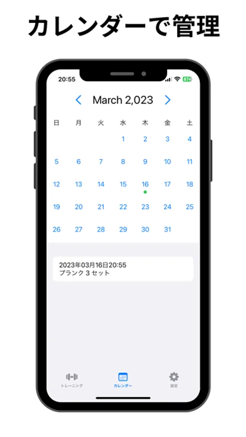 - カレンダーで筋トレをした日が管理できます。