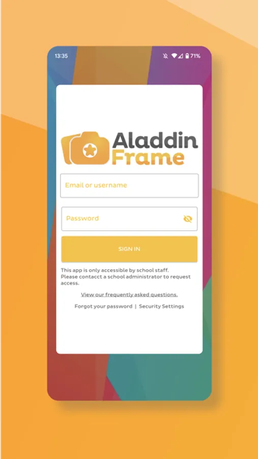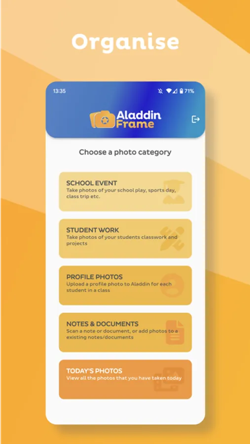 The Aladdin Frame App gives teachers and administrators the ability to log in using their Aladdin account to capture and securely store photos of school events and student work directly on Aladdin, bypassing their device storage.