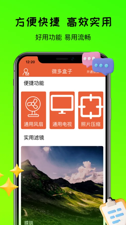这是一款支持对采用通用控制模式的智能风扇和智能电视进行遥控的App,只需要通过蓝牙连接设备即可控制设备,目前仅支持采用通用控制模式的智能电器设备。凡是连接上设备可以控制的都是采用通用控制模式的电器。还支持常用的照片压缩功能,也支持常用的滤镜,可以对自己喜欢的照片添加滤镜等!
