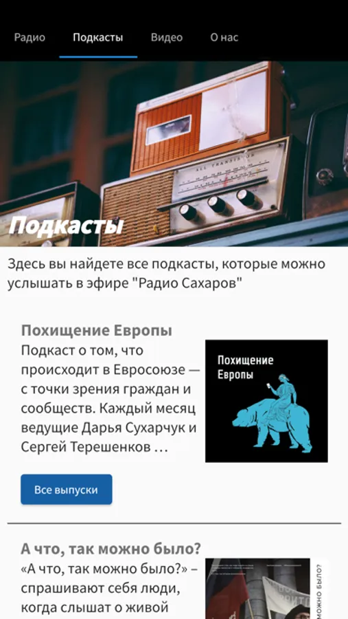 “Радио Сахаров” - это бесплатное радио, в котором есть подкасты от лучших русскоязычных студий и авторов, аудиоверсии главных материалов независимых сми, музыка и аналитика - свободное пространство, в котором есть место каждому.