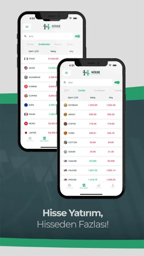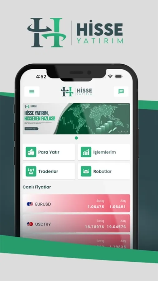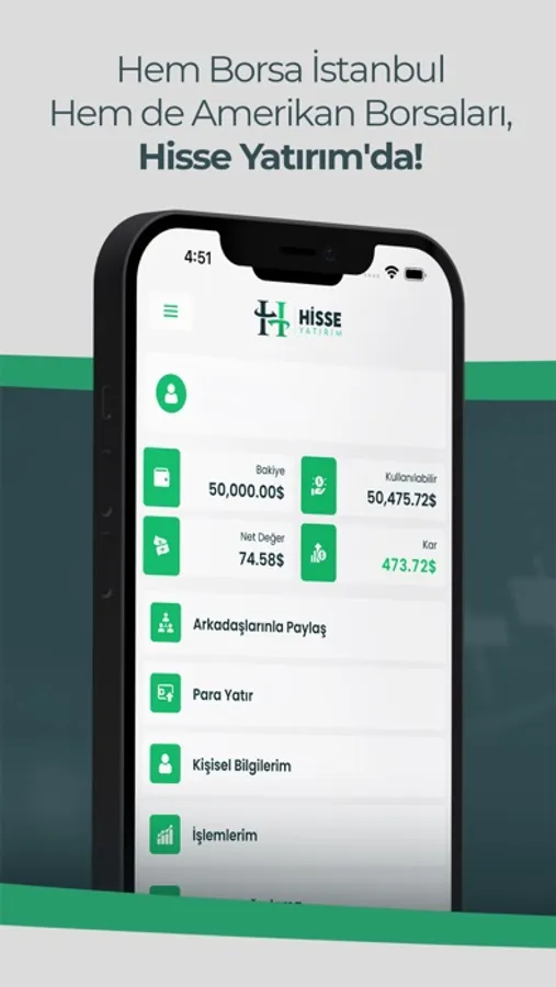 Hisse Yatırım Menkul Değerler Anonim Şirketi olarak kullanıcılarımıza Borsa İstanbul ve Amerikan Borsaları dahil tüm finans piyasalarına komisyonsuz bir şekilde yatırım yapabilme fırsatı sunuyoruz. Borsa, Döviz, Altın hepsi tek uygulamada. Hisse Yatırım, Hisseden Fazlası!