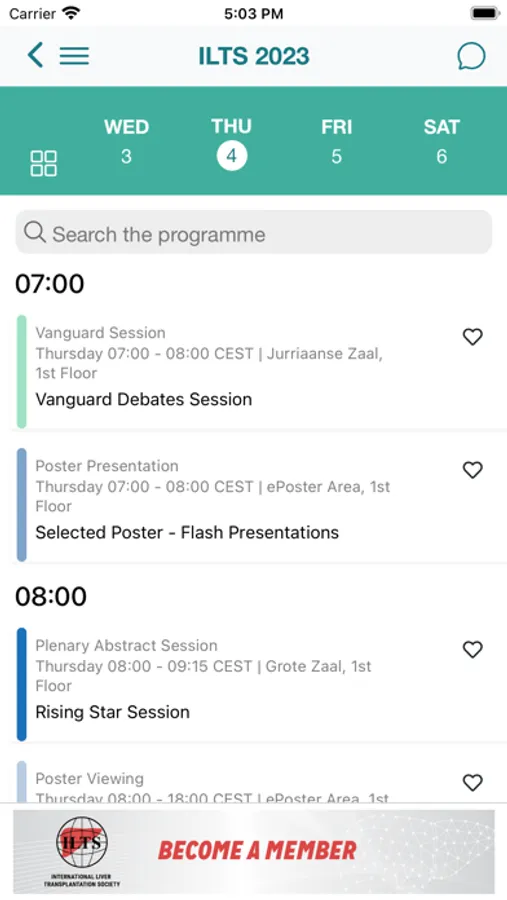 • "Program" gives you access to the scientific program and all relevant information about presentations and speakers.