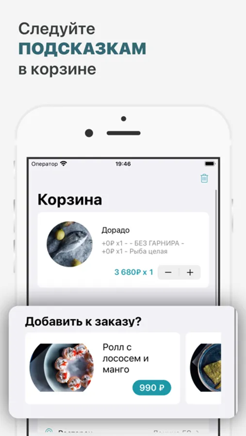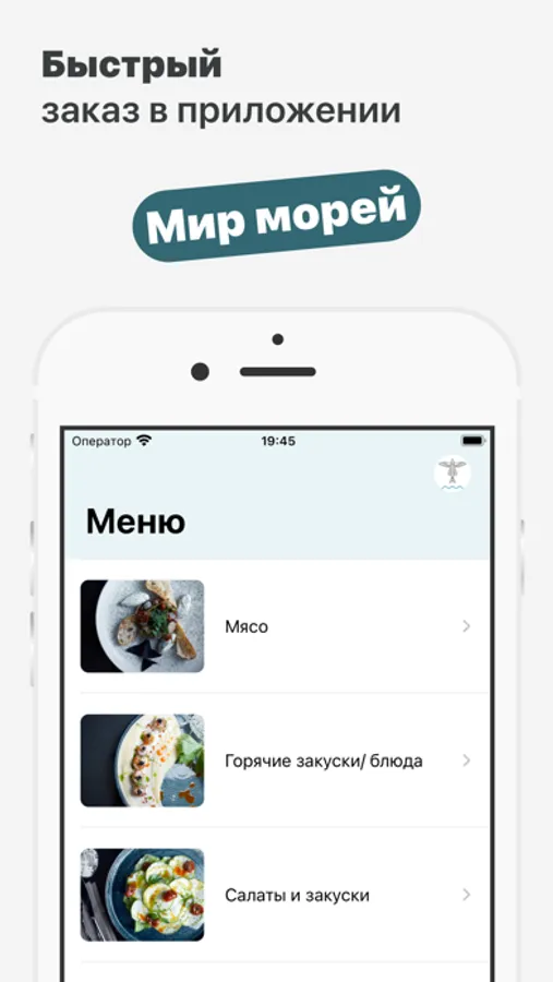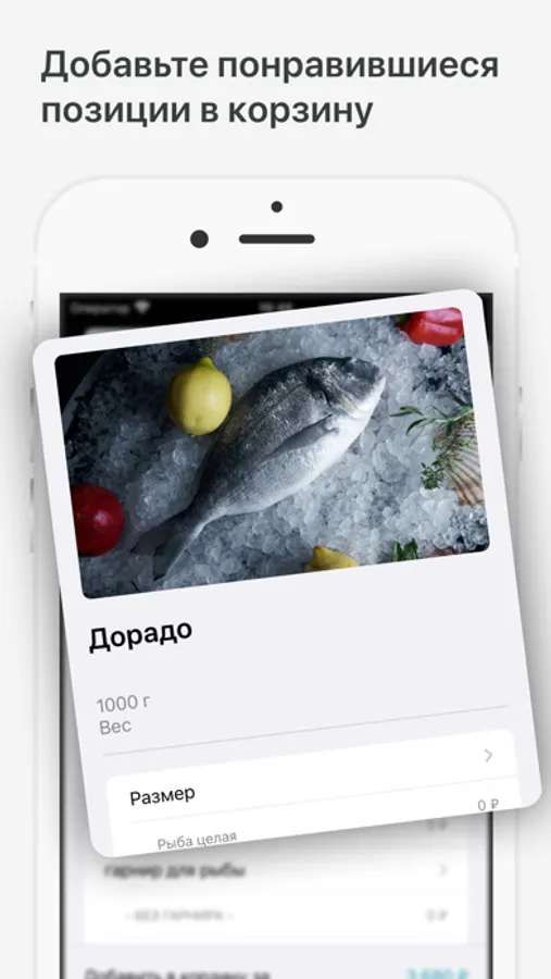 Как сделать заказ в приложении “Мир морей”: выберите понравившиеся позиции из меню, добавьте их в корзину и перейдите на экран оформления заказа (по нажатию на иконку корзины).