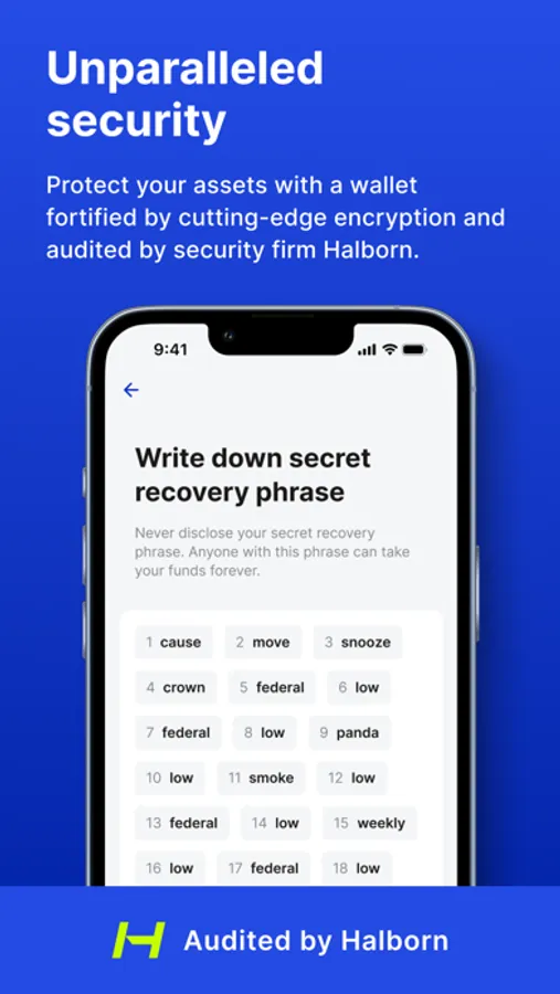 We take security seriously, and our wallet is designed to protect your funds. The Casper Wallet was audited by Halborn. We use industry-standard encryption to ensure that your CSPR tokens are always safe. As a fully self-custodial wallet, you are in charge of your secret recovery phrase - we never store your private keys or your secret recovery phrase on our servers, giving you complete and sole control over your funds.