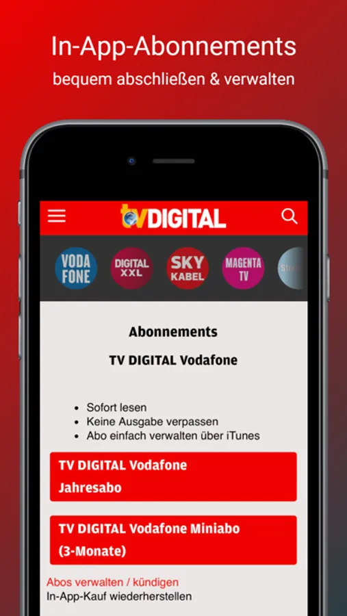 Bitte beachten Sie: Sobald Sie das Abo bestätigt haben, wird Ihr iTunes-Konto mit dem entsprechenden Betrag belastet. Das Abo verlängert sich automatisch um die entsprechende Laufzeit, wenn Sie die Verlängerung nicht bis 24 Stunden vor Ende der Laufzeit in Ihren iTunes-Benutzereinstellungen deaktivieren. Ihre Abos können Sie direkt nach dem Kauf in den Einstellungen Ihres Gerätes einsehen, bearbeiten und die Funktion der automatischen Verlängerung deaktivieren. Wenn Sie Ihr Abo nicht deaktivieren, wird Ihr iTunes-Konto innerhalb der 24 Stunden vor Ablauf des Abonnements mit dem entsprechenden Vertrag belastet. Eine Rückvergütung ist nicht möglich, sollten Sie das Abonnement während der Laufzeit kündigen wollen. Sie erhalten in jedem Fall alle Ausgaben bis zum Ende der abgeschlossenen Laufzeit.