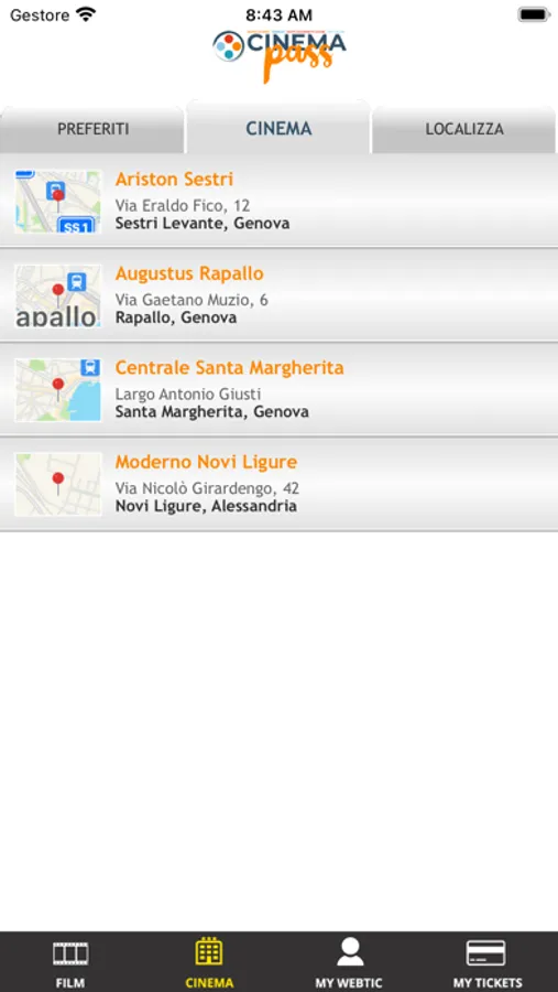Cinema Teatro Ariston di Sestri Levante, Cinema Teatro Centrale di Santa Margherita Ligure, Multisala Augustus di Rapallo e Multisala Moderno di Novi Ligure.