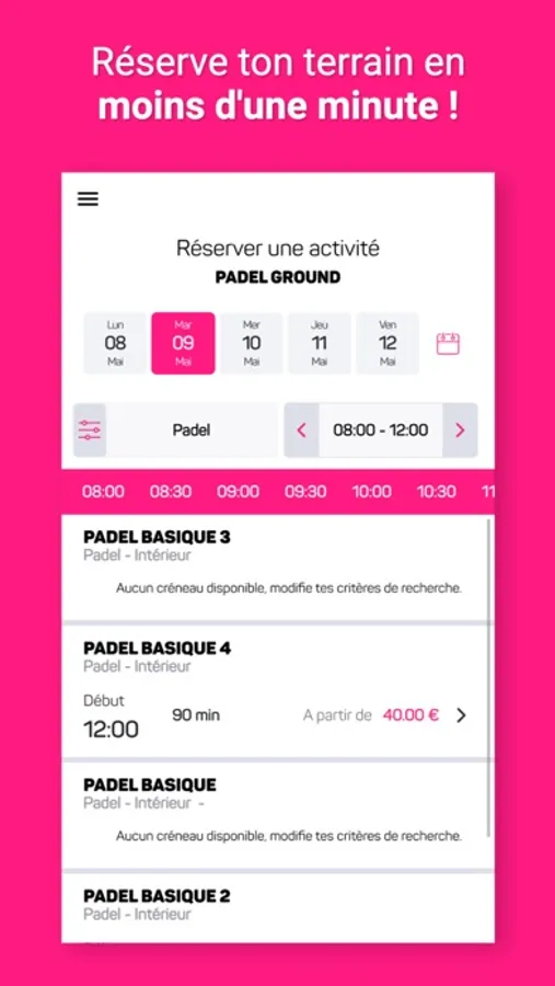 Fini la corvée de réservation ! Avec l'application tu n'as plus qu'à accéder aux créneaux disponibles et à en choisir un. Le club recevra alors automatiquement ta réservation.