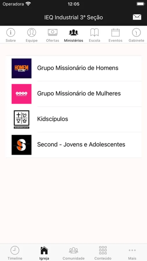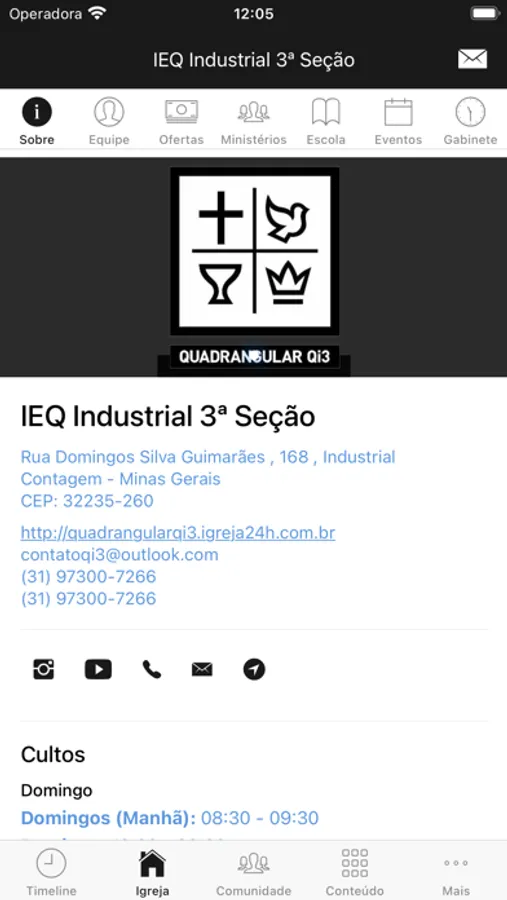 - Informações da Igreja (endereço, telefone, site, redes sociais, pastores)