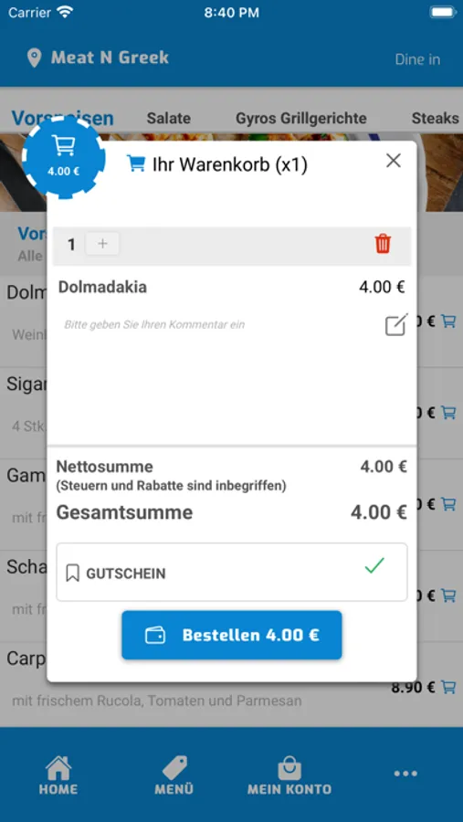 Herzlich Willkomen bei Meat N Greek in Übach-Palenberg. Wir bedienen unsere Kunden mit Gyros, Grill, Schnitzel, Salate Speisen und machen das seit mehreren Jahren aus Leidenschaft. Wir freuen uns immer wieder neue Kunden unsere Herkunft näher zubringen und möchten ihnen die Möglichkeit geben, ihre Bestellung unkompliziert und total einfach abzugeben. Aus diesem Grund, möchte wir ihnen unsere neue App und unseren Online Shop vorstellen, mit dem Sie problemlos über Paypal, Bar und Kreditkarte zahlen können.