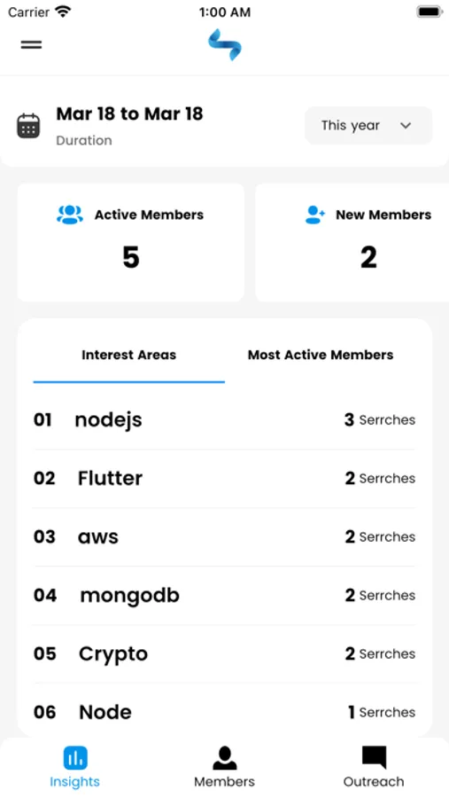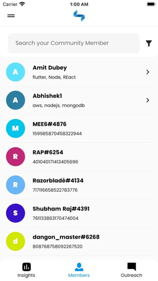 The second tab is members. Here you get a rich directory of your community members on an individual level. Their profiles, interest areas, their activity across platforms, etc