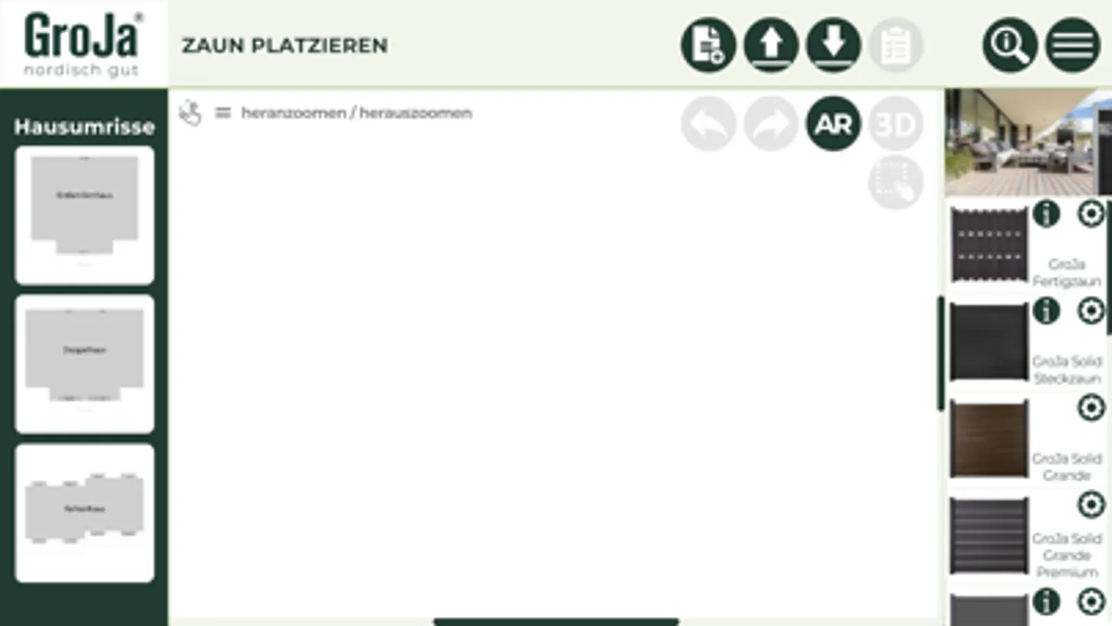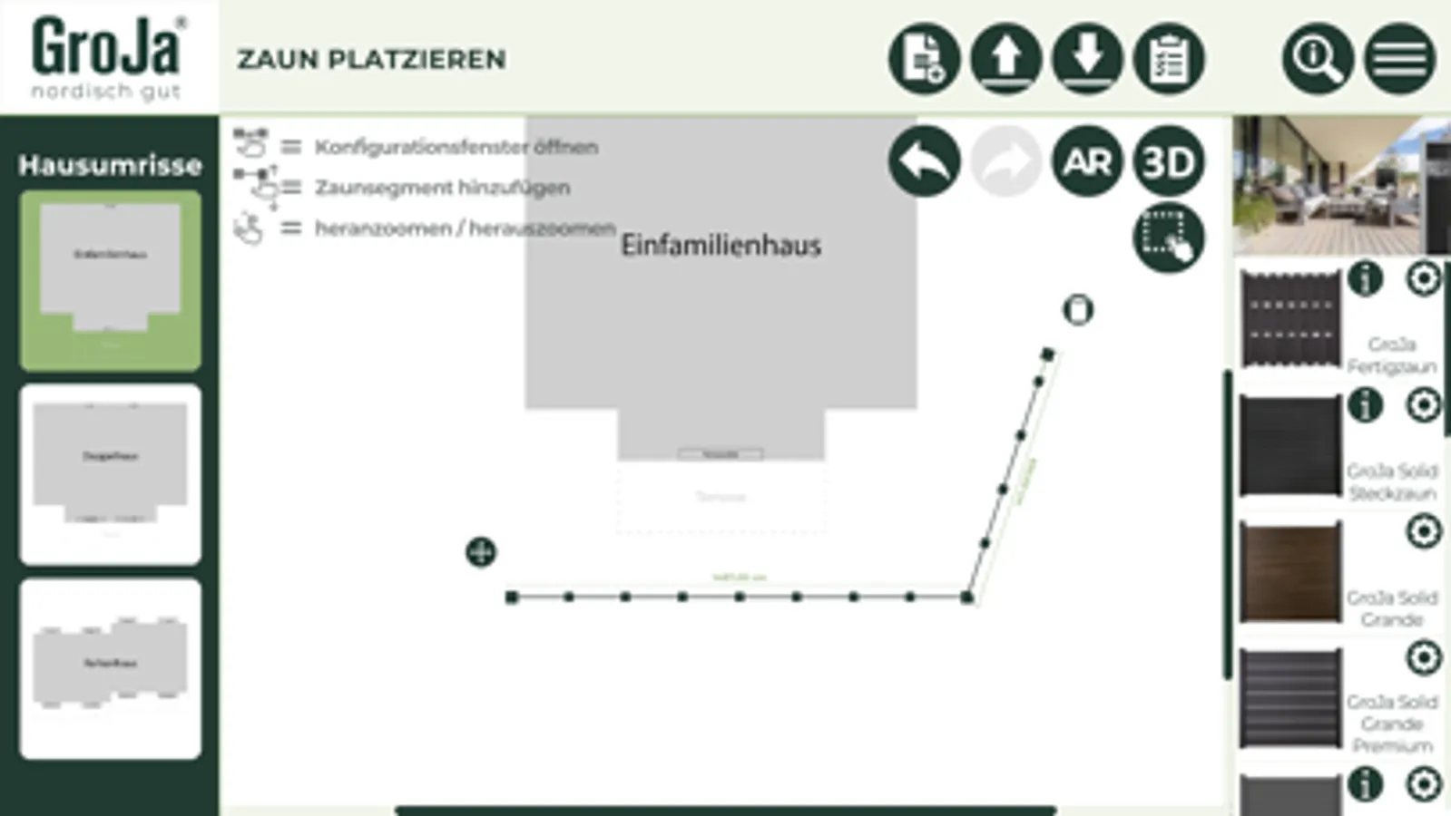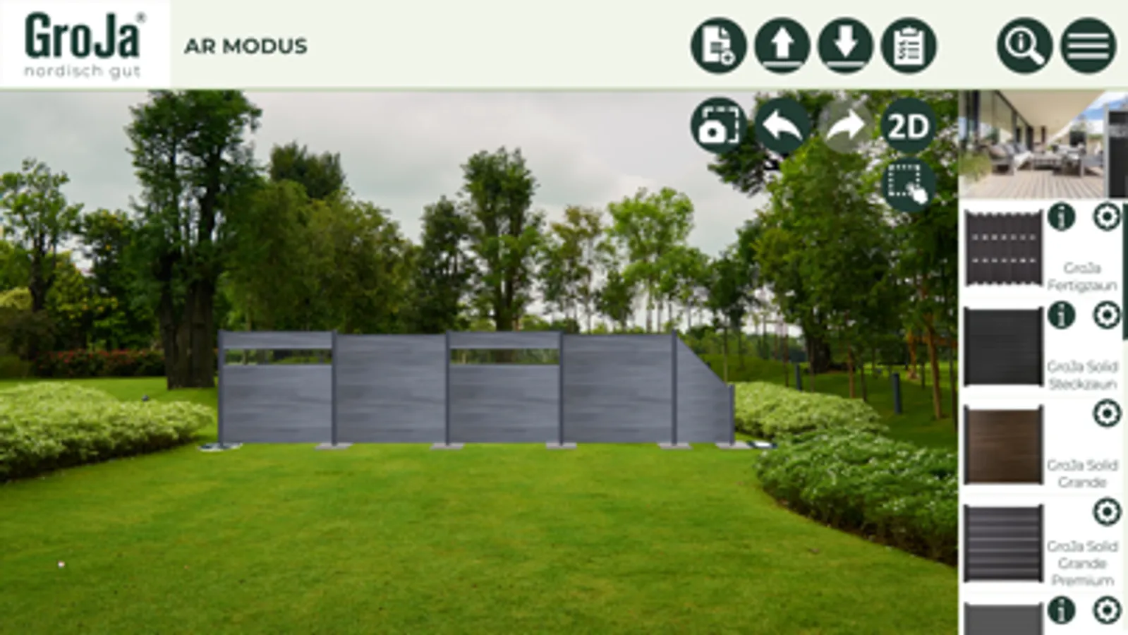 Sie möchten Ihr Projekt noch realistischer planen? Dann nutzen Sie doch einfach die AR-Funktion unserer App! Sie können mit unserer eigens entwickelten App auf Ihrem Tablet oder Smartphone per Augmented Reality die Planung Ihrer Zaunanlage direkt in Ihren örtlichen Gegebenheiten umsetzen. Ob im Garten oder auf der Terrasse, mithilfe der AR-Funktion haben Sie Ihr Wunschprojekt direkt vor Augen.