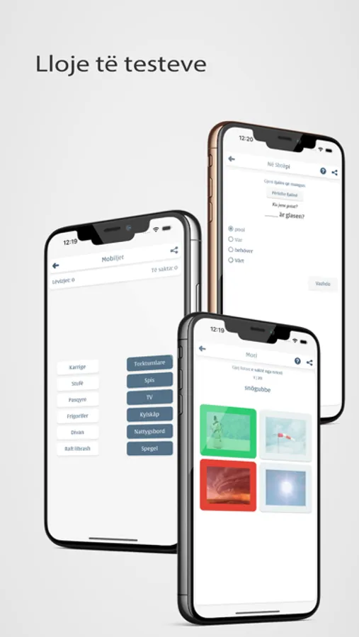 Testoni njohuritë tuaja nga lloje të ndryshme të testeve të ofruara nga aplikacioni si: P.sh. kombinimi i fjalëve me të njëjtin kuptim, gjetja e përgjigjes së saktë nga foto, përkthimi i fjalës ose fjalisë, dëgjimi i fjalisë dhe më pas shkrimi i saj, shqiptimi i fjalisë që shfaqet dhe të tjera.