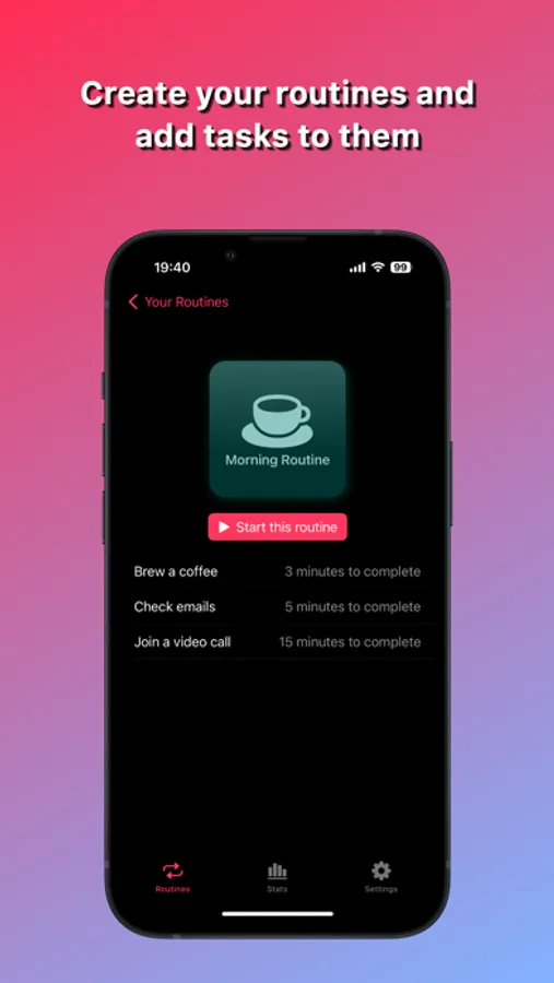 Creating a new routine with RoutineUp is simple and intuitive. Just add the tasks (up to three and unlimited in RoutineUp+) you want to do and set their duration. You can customize them to fit your schedule and lifestyle.