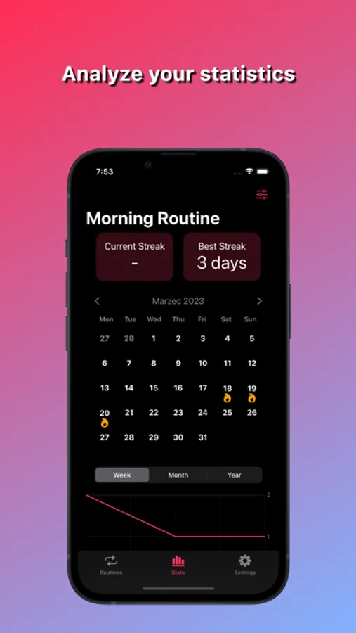 Once you start a routine, RoutineUp will track your progress and increase your streak by one each day you complete all the tasks in the routine. You can view your streaks for each routine and get motivated to keep going. RoutineUp+ (Premium plan) also provides you with personalized statistics that show your performance over time, including the total number of routines you've completed and your longest streak.