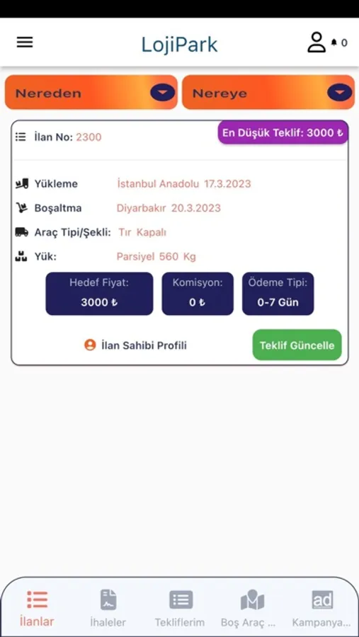 Yük ilanlarınızı yayınlayarak LojiPark'a kayıtlı bireysel araç sahiplerinden teklifler alın.