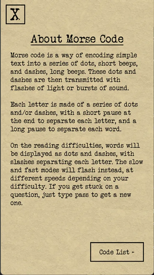 - A brief explanation of Morse Code and a Morse Code dictionary to learn from.