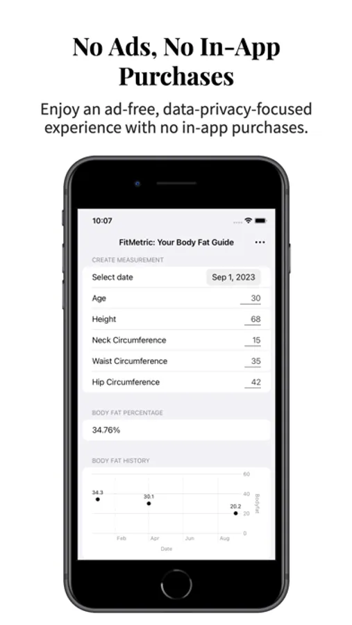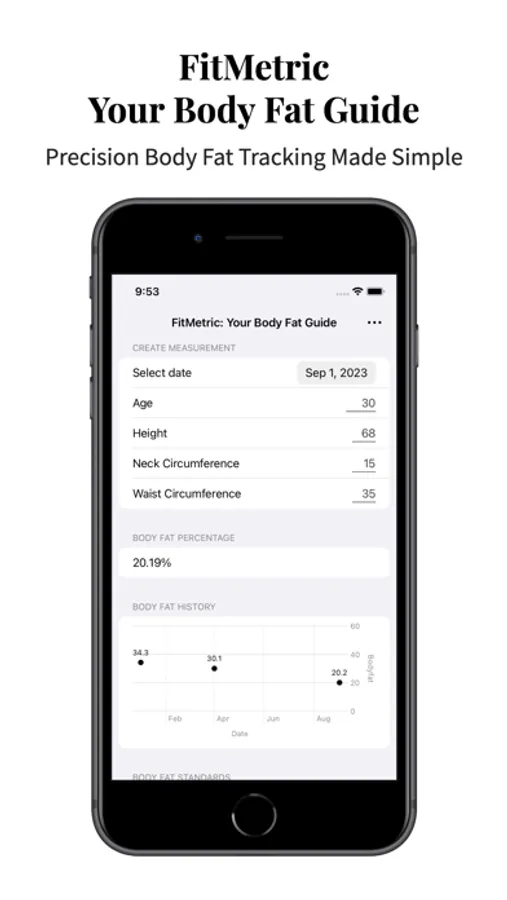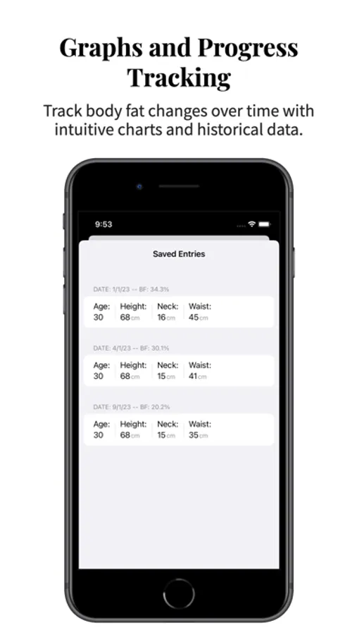 Charts and Historical Data: Monitor your health journey with intuitive charts and historical data. Get a visual overview of how your body fat percentage has changed over time and identify trends to make smarter decisions.