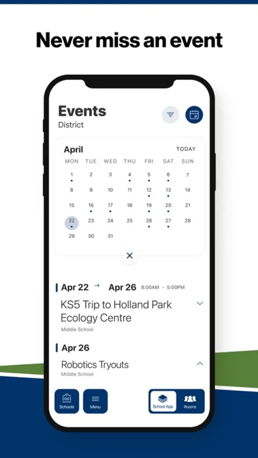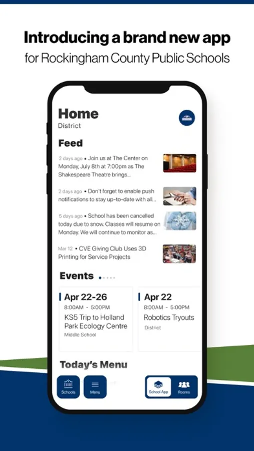 The event section shows a list of events throughout the district. Users can add an event to their calendar to share the event with friends and family with one tap.