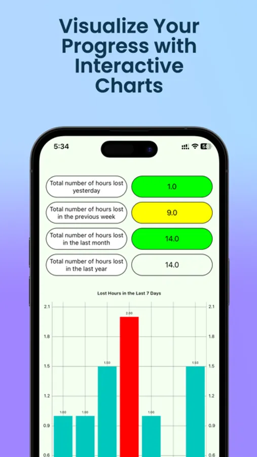 The second screen provides valuable insights into your lost hours, offering a comprehensive breakdown of yesterday, last week, last month, and last year's time utilization. Visualize your progress with an interactive chart that displays lost hours from the past week.