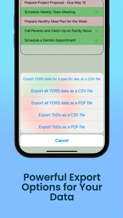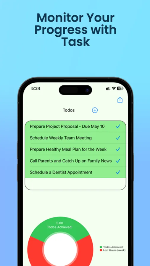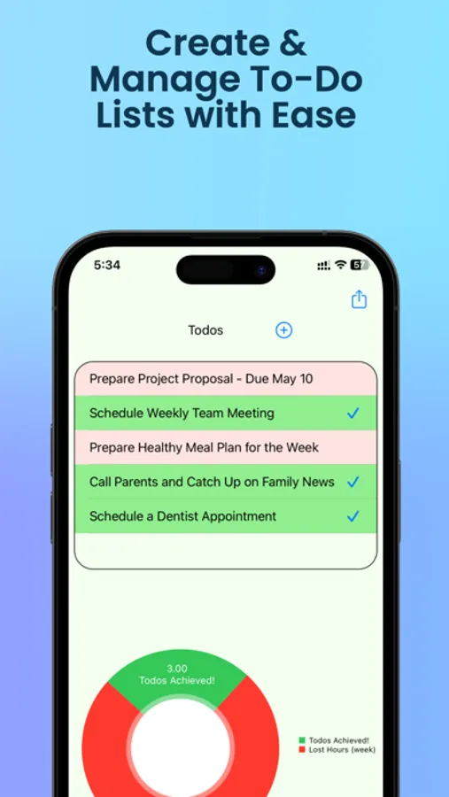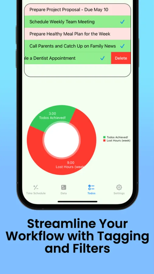 Unlock the full potential of our app with a subscription to access the third screen. Here, you can manage a dynamic to-do list, marking tasks as achieved or pending. Track your progress with a chart that compares lost hours with completed to-do items. Effortlessly export your data in CSV or PDF formats to analyze and share your productivity journey.