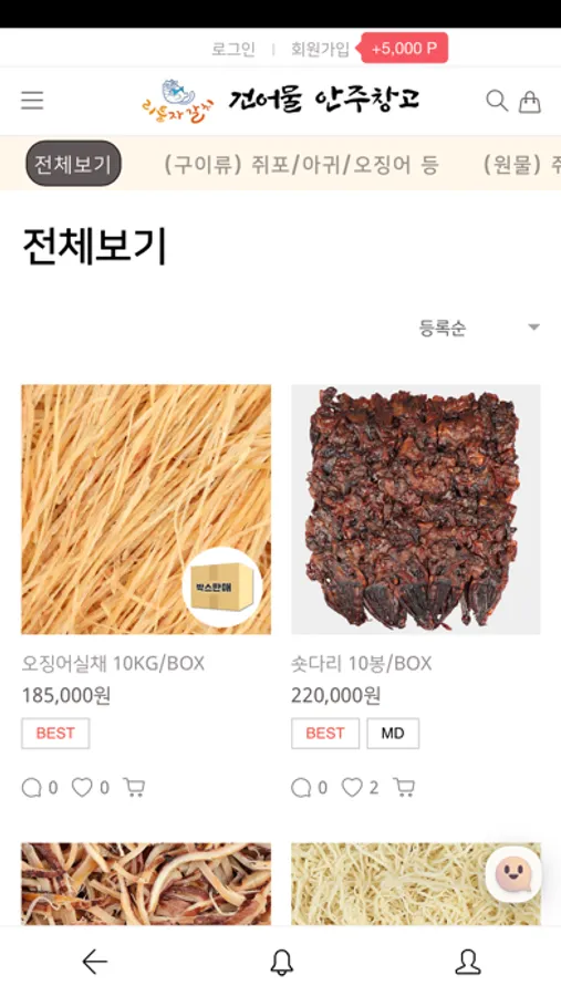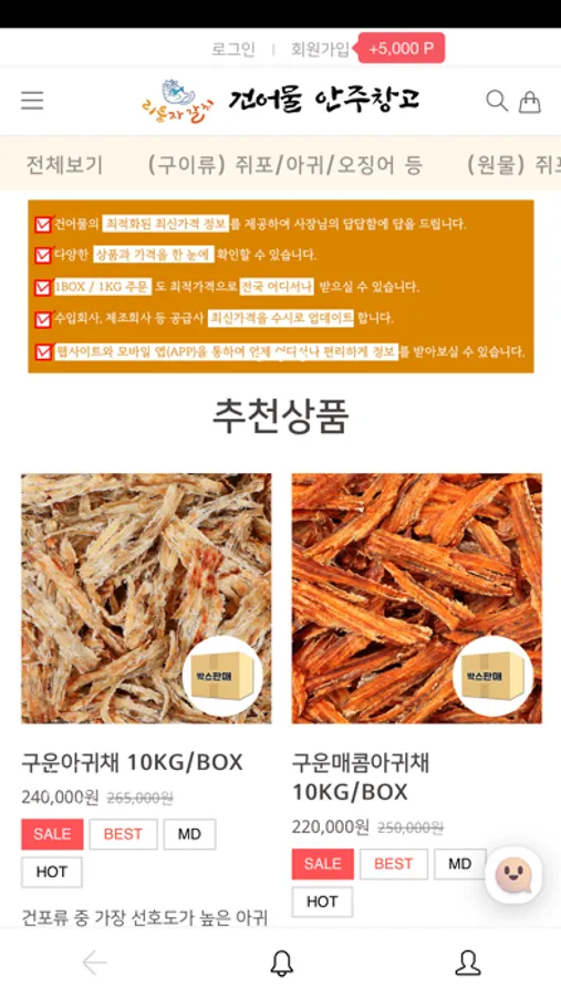 사업자를 위한 건어물 최저가 도매 쇼핑몰입니다. 부산에 위치하며 각종 건어물을 국내에서 직접 가공하여 유통하고 있습니다. 건어물 유통의 새로운 패턴! 언제 어디서나 앱에서 최신 가격 정보를 확인 할 수 있고, 소량이라도 전국 어디든 주문이 가능합니다.